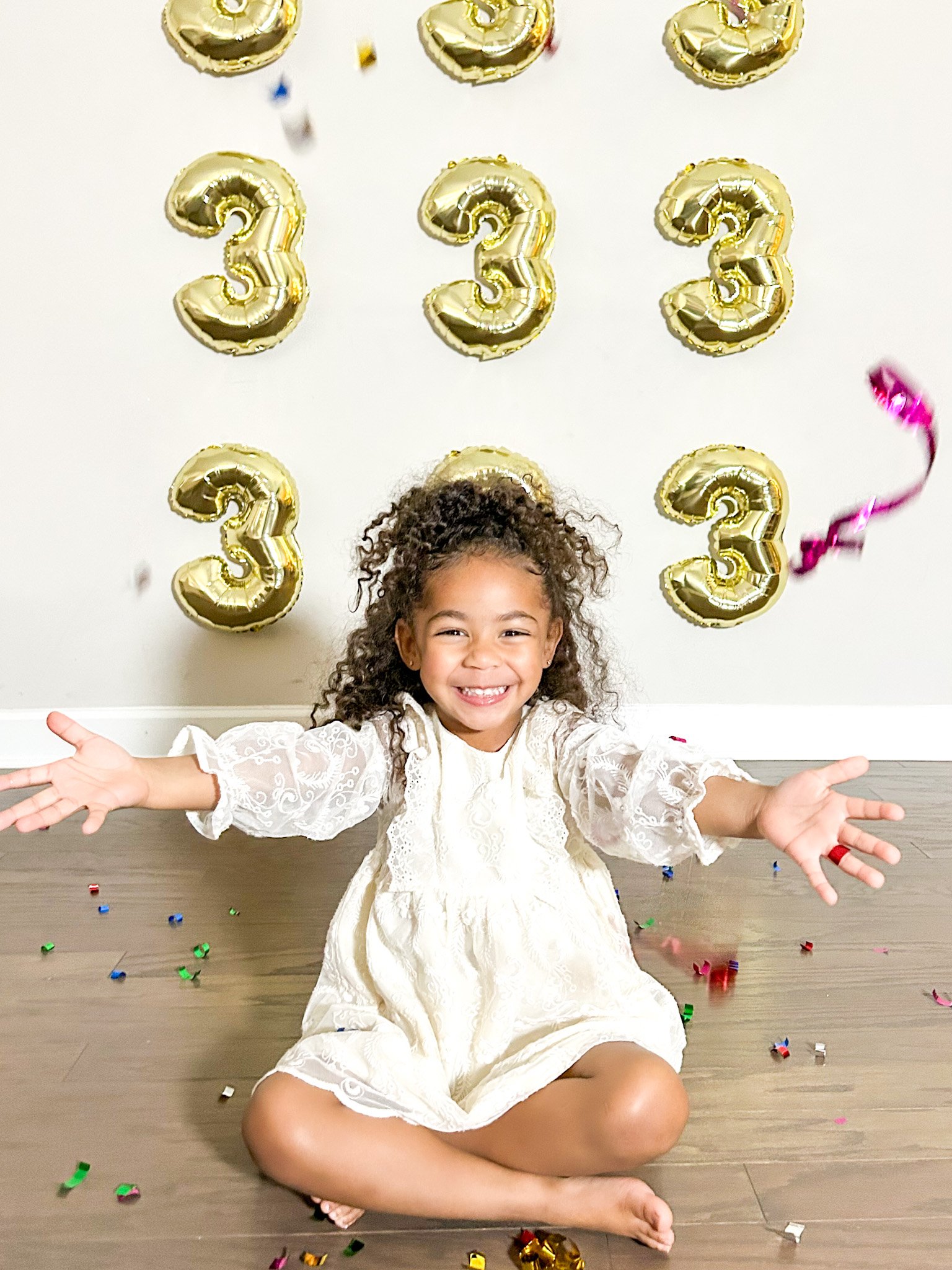 When Devyn’s 3rd birthday rolled around, I wanted photos that felt fun, celebratory, and professional—but I wasn’t ready to drop a studio fee on a model who might decide mid-shoot that she hates the camera, the outfit, or the very concept of joy.